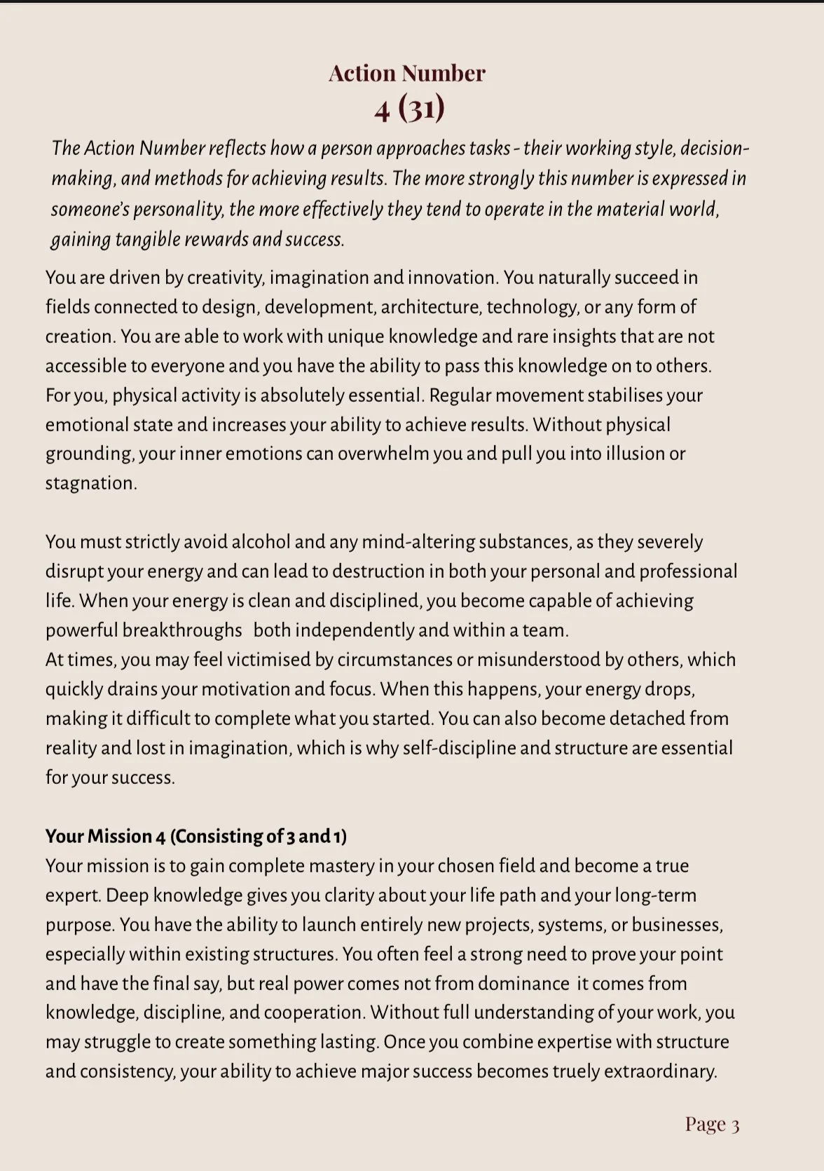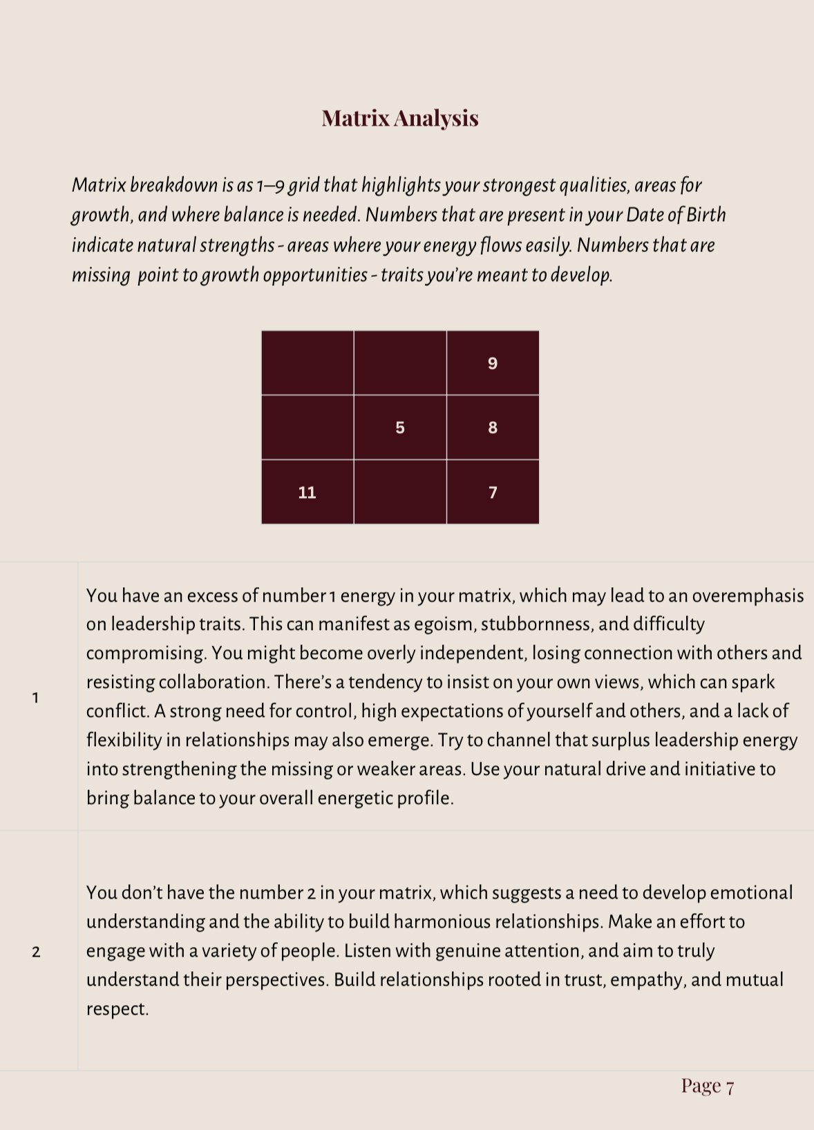 No. Most numerologists analyse Life Path number, but this is misleading. The sum of the date of birth does not show us the direction you will take in life. Rather, it is the theme of our life. In my reports, I go much deeper. I include not just the sum of the numbers, but also the Consciousness, Action, Self-Actualisation and Outcome Numbers, which reveal the bigger picture and ultimate purpose behind your journey. They are the puzzle pieces, that when joined together, form a complete and whole picture of our energetic essence. I analyse double numbers to uncover the hidden layers of your personality. For example, instead of only saying “you’re a 6,” I break it down into its building blocks (4 + 2) showing you why your 6 expresses the way it does. This method gives you the most accurate and specific understanding of your strengths, challenges, and purpose far beyond a one-size-fits-all description.